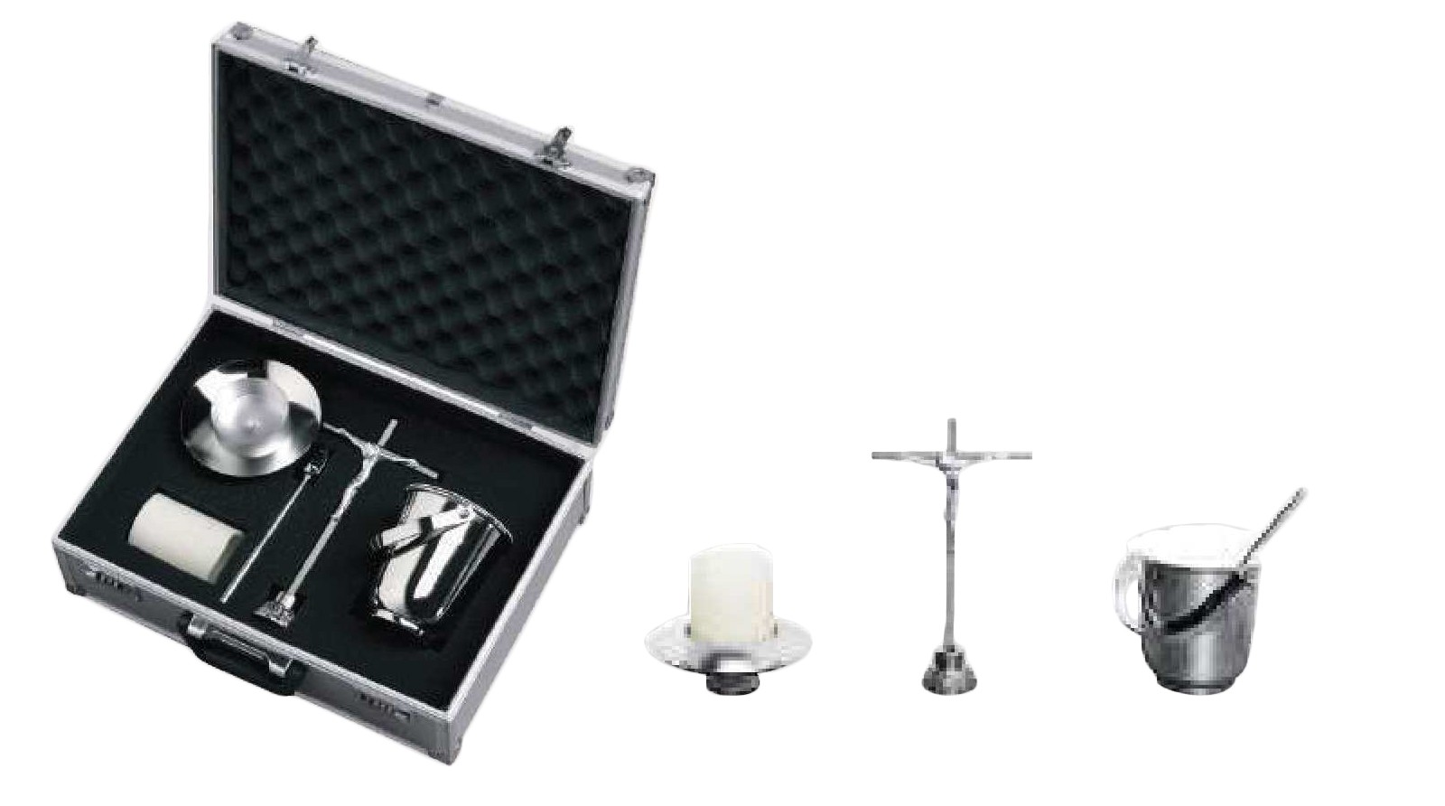 Mallette contenant du matériel de table: Bénitier, goupillon, chandelier avec bougie LED et croix de table