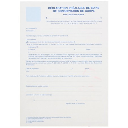 Déclaration préalable de soins de conservation de corps, paquet de 25