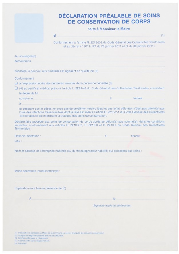 Document de Déclaration préalable de soins de conservation de corps.