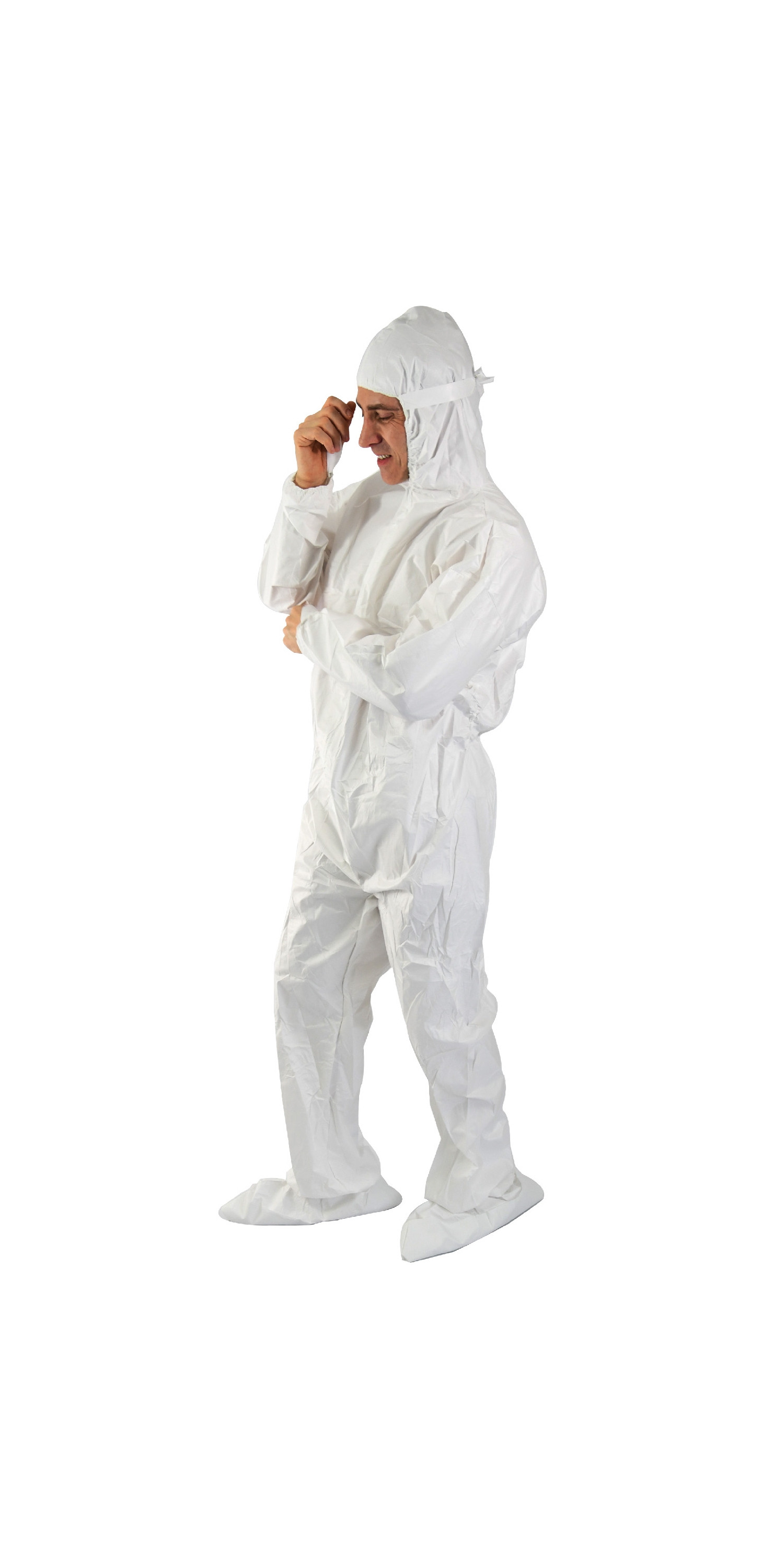 Combinaison en non-tissé microporeux avec capuche élastiquée, élastiques poignets, taille et chevilles.