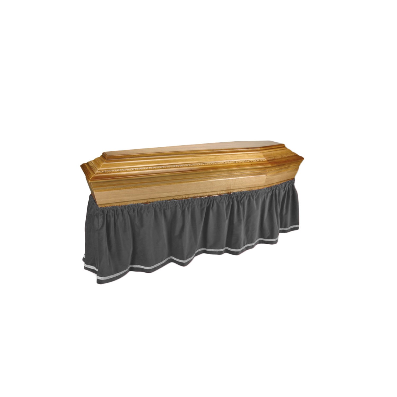 La jupe de cercueil est élastique pour s'adapter à tous les modèles. Elle possède également une sécurité en haut par bande velcro et une attache métal.