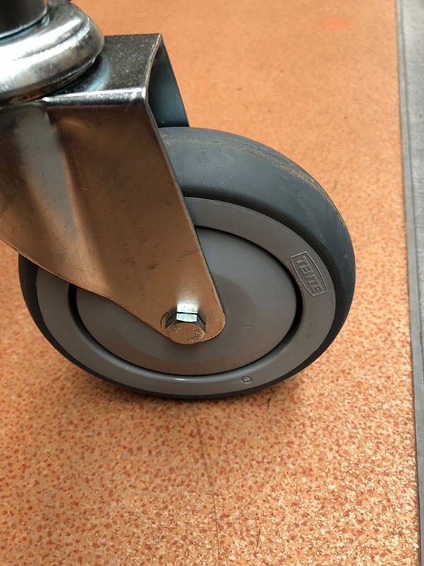 4 roues dures diamètre 12.5 cm dont 2 avec freins, bandage de roulement non tachant