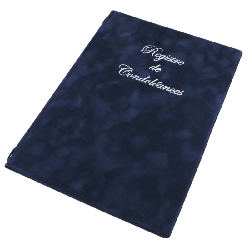 Registre de condoléances en suédine fournis avec une double feuille de garde et 4 double feuilles de signatures pour les modèles à cordelière et une page de garde avant et arrière perforée et 8 feuilles de signatures perforées pour les modèles à anneaux