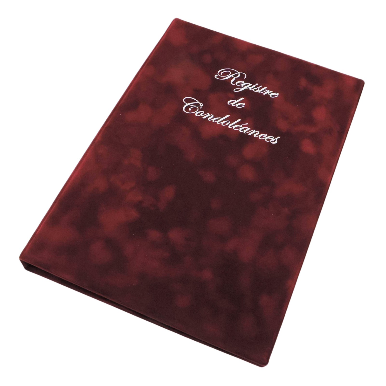 Registre de condoléances en suédine fournis avec une double feuille de garde et 4 double feuilles de signatures pour les modèles à cordelière et une page de garde avant et arrière perforée et 8 feuilles de signatures perforées pour les modèles à anneaux