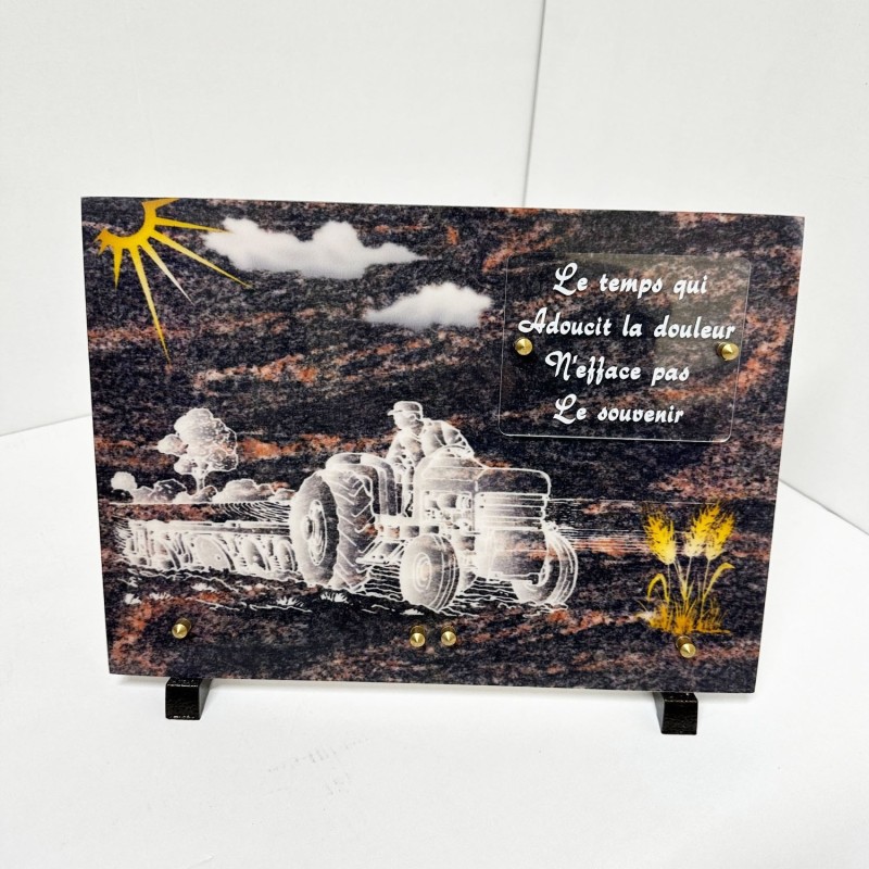 Plaque funéraire composite imitation granit, Thème Tracteur en labour