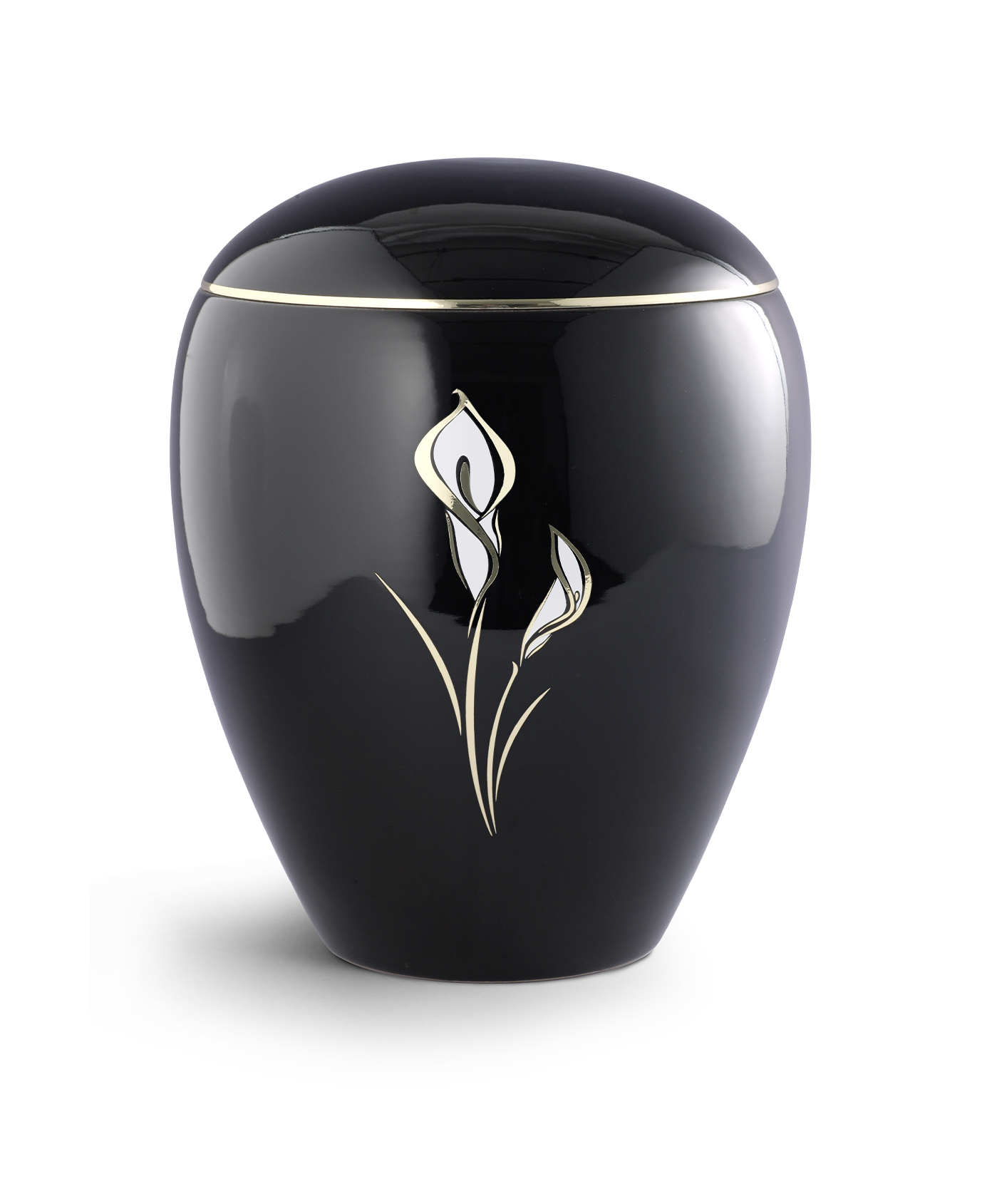 Urne céramique, noir profond brillant avec décor d'arum en or