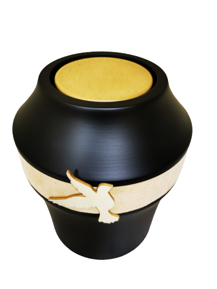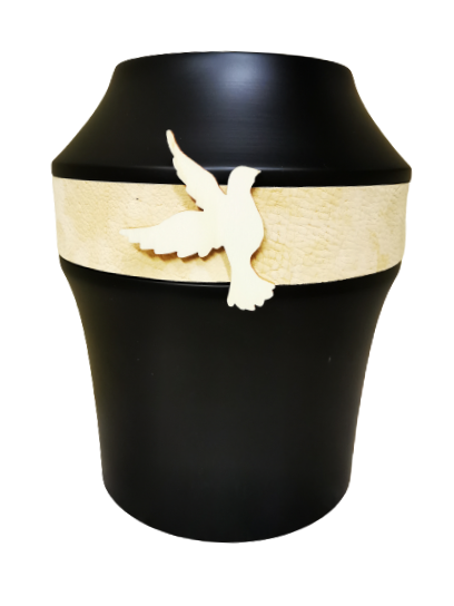 Urne funéraire en bois avec décor bandeau en cuir et colombe en bois