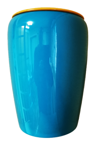 Urne funéraire en bois laqué de couleur bleu lagon et curry
